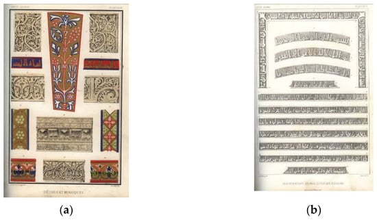Prangey published four plates on the Mosque-Cathedral of Cordoba in his work “Essai sur l’architecture des Arabes et des Mores, en Espagne, en Sicile et en Barbarie” (1841) []. One includes an elevation and details from the Villaviciosa Chapel (plate 3; Figure 10a). Another plate is a perspective section from the space next to the mihrab (plate 6; Figure 10b), which was drawn by Nicolás Chapuy, and it included in the same plate a similar image from a mosque in Toledo. It also includes a plate with coloured details (plate 4; Figure 11a) and another with Arabic inscriptions (plate 5; Figure 11b).