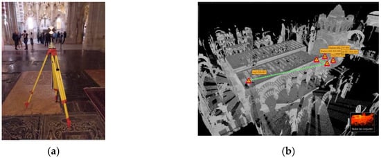 To link the Royal Chapel, located on a higher level, in the same coordinate system, the C10 was stationed at mq7 and oriented at mq1 with an error of 4 mm, after which it performed a scan. Three additional free scans were carried out in the Royal Chapel, which were recorded automatically with the Cyclone Register 360 software, resulting in an error of 4 mm in all the links. The distribution of the stations is shown in Figure 14b.