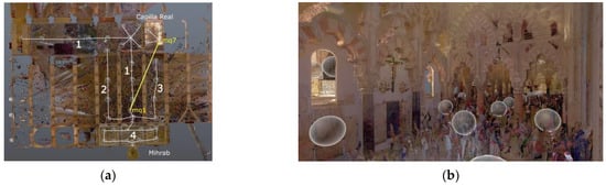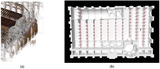 Detail from the Al-Hakam II expansion in the Mosque of Cordoba: (a) Overlapping between the geometric model and the point cloud; (b) 3D geometric model derived from the point cloud (view from bottom). Source: Own images.