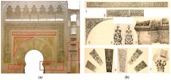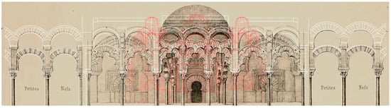 A perspective of the Royal Chapel was erroneously entitled Capilla de Villaviciosa (plate 2; Figure 8a), which is located right next to it, where Abd al-Rahman II’s mihrab was. The archeries with double arches can be seen at the bottom of the drawing. Another plate including a mihrab sectional elevation is framed by decorative details (plate 8; Figure 8b).