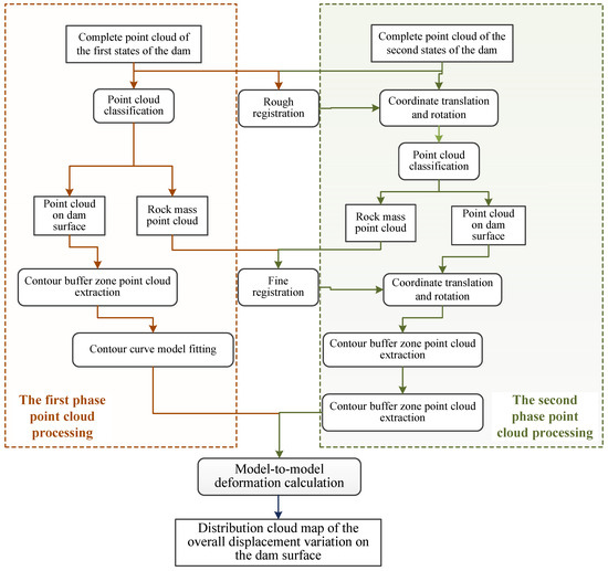 Dam displacement monitoring based on TLS is able to fully describe the displacement changes on the dam surface. In order to improve the accuracy and efficiency of the registration, and apply it to the natural scene around the dam, the complete point clouds and rock mass point clouds of the second status are incorporated into the first phase’s coordinate system via rough to fine registrations by the ICP algorithm. Then, the model-to-model distance calculation and dam surface displacement variation analysis are described using contour model construction and curve fitting in order to eliminate the influence of point cloud roughness on the comparison accuracy. The flow chart describing this process is shown in Figure 1.