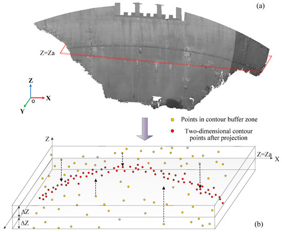 Due to the irregular discrete distribution characteristics of the point cloud, a contour buffer zone is developed for any elevation value Za to better fit the contour curve model. As shown in Figure 2a, the buffer zone radius should be marginally above the point cloud density. Then, the point cloud in the buffer zone is projected along the Z axis to the Z = Za projection plane to form a two-dimensional contour point cloud, as shown in Figure 2b.