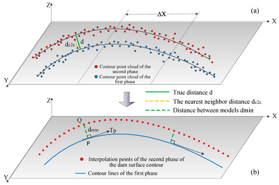 After fitting and optimizing the contour point cloud model, taking the first phase data as a reference, the distance between the interpolation points on the second phase contour model and the first phase contour model is compared under the corresponding elevation to describe the calculation of dam surface displacement variation. As shown in Figure 3b, the shortest distance from the interpolation point Q of the second phase contour to the first phase model curve is the distance between the two models at this position (the details were specified in reference [66]). By calculating the shortest distance from all the interpolation points of the second-stage model to the first-stage model, the displacement distribution of the two dam surfaces at the same elevation can be obtained. As shown in Figure 3a,b, there is a large error between a comparison distance based on the nearest point and the real distance of the two groups of data in the point cloud with a large roughness, while the distance between the contour models is not affected by the roughness of the point cloud, which can more accurately describe the displacement variation of the dam surface.