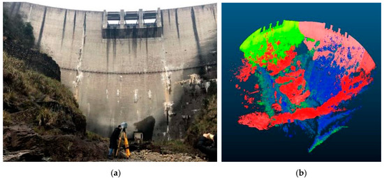 (a) Xiahuikeng Arch Dam and (b) two-phase point cloud used in the experiment.