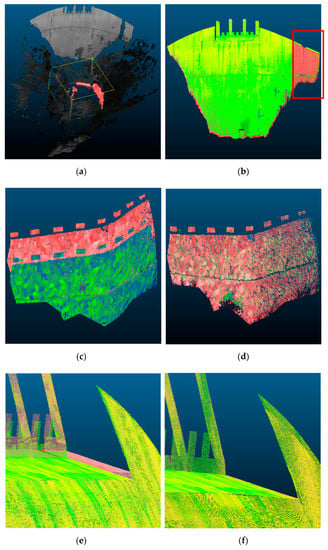 Two registrations based on the complete point cloud and rock mass point cloud. (a) The rock mass in front of the dam used for secondary precision registration; (b) two-stage dam surface point cloud after the second fine registration and classification; (c) two-stage rock mass point cloud for the first rough registration; (d) two-stage rock mass point cloud for the second fine registration; (e) part of the point cloud of the two dam faces after the first rough registration; and (f) part of the point cloud of the two-stage dam surface after the second fine registration.