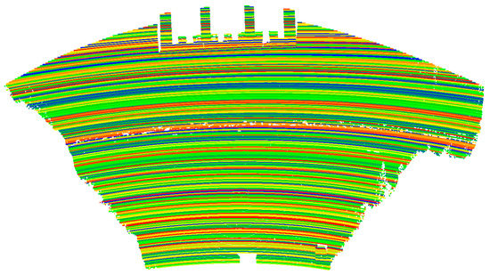 By establishing the contour model of the point cloud of the two states and calculating the distance between the models, the analysis of the displacement change across the dam surface and any height of the two states is described. To ensure a sufficient number of point clouds in the contour buffer zone and to achieve a complete comparison of the displacement changes in the dam surface, the dam surface, and the contour buffer strips with a distance of 0.02 m are extracted, for a total of 3891 buffer strip data points, as shown in Figure 6.