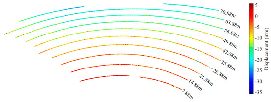 In the experiment, the distance between the models was calculated for all 3891 curve models, and the overall displacement change distribution cloud map of the downstream face of the Xiahuikeng Dam was obtained, as shown in Figure 9a. This figure shows that the point cloud of the dam surface of the second phase has an overall negative displacement change (i.e., toward the upstream direction) relative to the first phase. The displacement change of the dam gradually increases from the base to the crest, and the displacement of the middle part of the dam is higher than that of the left and right sides, as shown in Figure 9a,c. Since the water level in the reservoir area was higher during the first phase of data collection, the hydrostatic pressure on the middle of the dam will increase as the water level increases, and the pressure on both sides will gradually decrease. Therefore, the analysis results of the dam displacement change appear to describe the real situation accurately. Figure 9b shows a statistical histogram of the dam surface displacement changes in the two periods. The abscissa is the dam displacement change, and the ordinate is the number of point clouds in the interval of different displacement changes. The Gaussian distribution curve is calculated using the statistical histogram, and the interval under the 95% confidence level is the real displacement change in the dam, which is primarily concentrated between −28 mm and −4 mm. Figure 9c shows the displacement changes in the left, right and middle parts of the dam with different elevations.