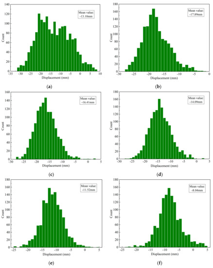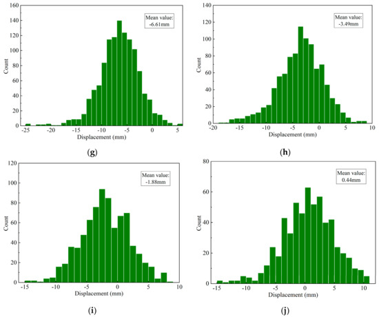 Statistical histogram of dam surface displacement changes under different elevations. (a) Z = 70.88 m; (b) Z = 63.88 m; (c) Z = 56.88 m; (d) Z = 49.88 m; (e) Z = 42.88 m; (f) Z = 35.88 m; (g) Z = 28.88 m; (h) Z = 21.88 m; (i) Z = 14.88 m; and (j) Z = 7.88 m.
