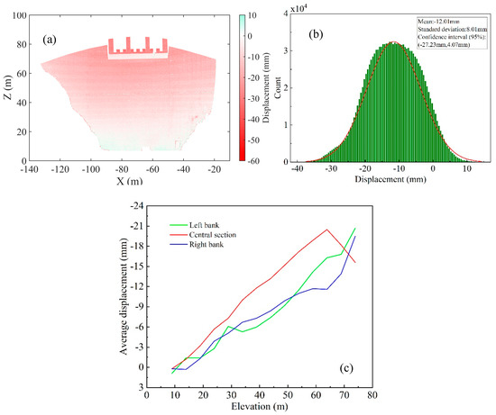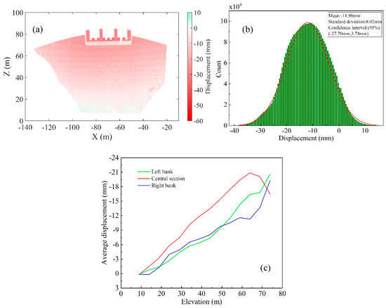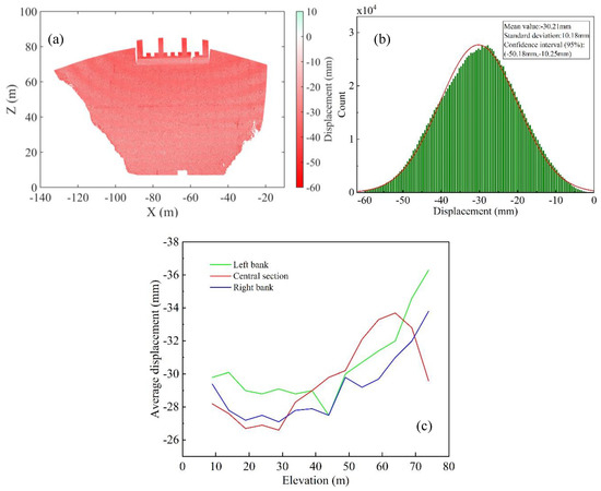 Results of dam displacement changes by point cloud to point cloud (C2C). (a) Cloud map of dam displacement variation distribution; (b) statistical histogram of displacement changes; and (c) average displacement changes of different parts of the dam with different elevations.