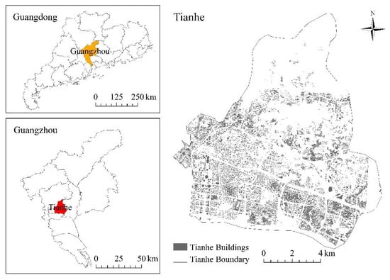 As shown in Figure 1, in this study, we selected Tianhe District of Guangzhou in China as our study area. Located in the eastern part of Guangzhou, it had a population of 1,545,700 in 2015 and a total area of 137.38 square kilometers (Bureau of Statistics of Guangzhou 2015, http://112.94.72.17/portal/queryInfo/statisticsYearbook/index, accessed on 19 August 2020). As the new downtown area and commercial center of Guangzhou, Tianhe District has a large number of commercial and office buildings. Meanwhile, there are also many industrial buildings and urban villages in the Tianhe District. The variety of building types and the highly mixed building functions make Tianhe District an ideal study area for this study.