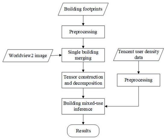 To overcome the limitations of existing studies, a tensor decomposition-based method that integrates information from both high-resolution remote sensing images and social sensing data is proposed in this paper to infer a building’s mixed-use functions. As a high-order generalization of the matrix singular value decomposition and principal component analysis, tensor decomposition not only can decompose the n-dimensional array to obtain the different characteristic patterns as well as the correlation between objects and characteristic patterns in each dimension, but also can obtain the relationship between characteristic patterns in different dimensions. Considering that the temporal population distribution inside buildings has space-time dimensions, by constructing a tensor of changes in human activities within the building over time and decomposing it, we can obtain different human activity patterns inside buildings unsupervised and infer the mixed use of the building through these patterns. Therefore, tensor decomposition is very suitable for the inference of a building’s mixed-use functions. Two advantages of our study are as follows: First, we realized the unsupervised and automatic extraction of the stable human activity characteristics inside buildings by applying a tensor decomposition algorithm. Second, we improved the building recognition rate by integrating high-resolution remote sensing images and social sensing data. A case study in Tianhe District, Guangzhou, China illustrates the advantages of our method. The rest of this paper is organized as follows. The study area and datasets are described in Section 2. Section 3 provides a detailed description of the tensor decomposition-based method, and Section 4 and Section 5 report the experimental results and discussion, respectively. Finally, the study is concluded in Section 6.