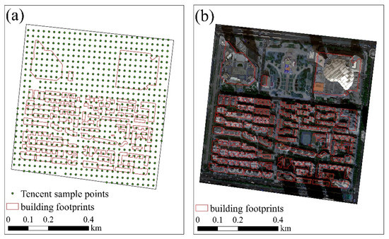 (a) Building footprints and Tencent user data in a sample area in Tianhe District, and (b) Building footprints and Worldview2 image in the same area.