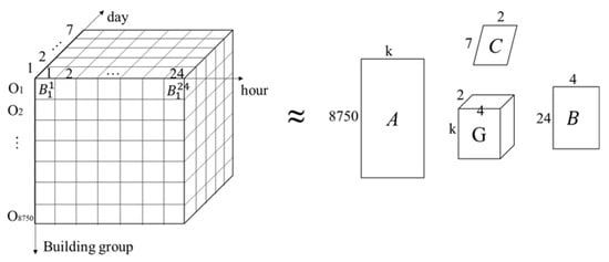 Tucker decomposition decomposes a tensor into a core tensor multiplied (or transformed) by a matrix along each mode [27]. Taking the third-order tensor χ∈R^(I × J × K) as an example, a Tucker decomposition of χ with the number of decomposition components of three dimensions (set as a, b and c) yields a core matrix G∈R^(a × b × c) and factor matrices A∈R^(I × a), B∈R^(J × b) and C∈R^(K × c) on the three dimensions. Each column of the factor matrix is a component representing a pattern in the feature space, while each row represents values of an object in different patterns, indicating the correlation between that object and different patterns. A larger pattern value indicates a closer correlation between the object and the pattern. The core tensor represents the intensity of the interactions between patterns in different factor matrices. Based on these theories, we can decompose the tensor T into the three factor matrices A, B and C and a core tensor G. Factor matrices A, B and C represent the building function mode, the time mode and the date mode, respectively, while the core tensor G reflects the relationship between the three factor matrices’ patterns, as shown in Figure 3 and Equation (2). In function factor matrix A (N × k), each row represents a building group and each column represents a building functional pattern, while the pattern values in matrix A represent the correlation between the building groups and building functional patterns. In time factor matrix B, each row represents an hour of the day and each column represents a time pattern, while the pattern values in matrix B represent the correlation between the hours of the day and time patterns. In date factor matrix C, each row represents a day of the week and each column represents a date pattern, while the pattern values of matrix C represent the correlation of days of the week with date patterns. After determining the building types of k functional patterns, we can infer the building’s mixed-use functions based on matrix A.