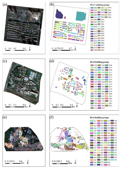 Single building merging results, (b,d,f), and their corresponding Worldview2 images, (a,c,e), of the three sample areas in the Tianhe District.
