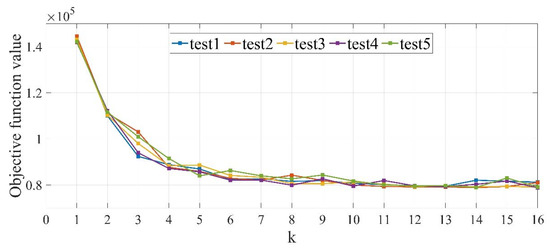 Before constructing the tensor T that responds to the building vitality, we determined the pattern number k of the functional factor matrix A by minimizing the cost function. We conducted five sets of tensor decomposition experiments, with different k values in the range of 3–15. As shown in Figure 6, the five curves represent the five groups of experiments, respectively. It can be seen that for all the five groups of experiments, the cost function curves all decreased rapidly when k increased from 1 to 7, but became quite stable after that. Therefore we set the value of k to 8 and the size of the core tensor G as 8 × 4 × 2.