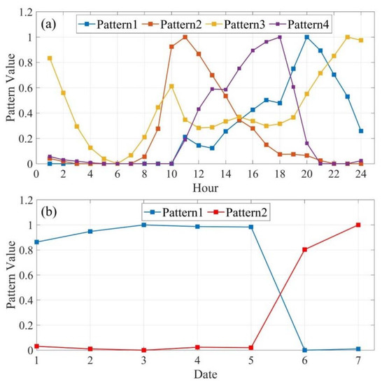 Factor matrix characteristic patterns (a) correlation of time patterns with 24 h; (b) correlation of date patterns with 7 days.