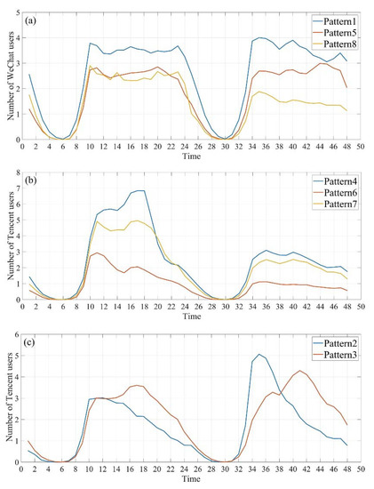 To further validate the inferred results, we plotted the curves of the average number of Tencent users in all buildings corresponding to the eight types of building functions over time, and observed the human activity patterns in buildings with different functions. Here, we did not consider the mixed use of the building. The function of each building group was determined according to the maximum function mode value corresponding to the function factor matrix A. We separately counted the average weekdays and weekends of the eight different functional buildings with temporal human activity curves, as shown in Figure 8. The values of 1–24 on the horizontal axis represent the averaged 24 h of the weekdays, while the values of 25–48 represent the averaged 24 h of the weekends. The vertical axis represents the average number of Tencent users of a specific type of building at a certain time, which reflects the population activities inside those buildings at that time. It can be observed that all three curves reflect the distinct characteristics of residential buildings, i.e., showing the peak times of human activity around 11:00 p.m. Pattern 1 and Pattern 5 maintained the same population on weekdays and weekends, while it was different in Pattern 8, which showed a significantly smaller number of people on weekends than weekdays. This indicates that there is an outflow of the population from buildings of Pattern 8 during the weekend. Figure 8b shows the average temporal human activity curves corresponding to the three working functional patterns. All three curves showed clear peak times of human activity in the morning and afternoon on weekdays, becoming smooth on the weekends. These three curves, compared with the weekdays, showed a significant decrease in the number of people on the weekends, which are typical curves of the working function. The difference among the three curves was that the afternoon human activities of Pattern 4 were significantly more active than the morning human activities on the weekdays; Pattern 7 showed similar human activities in the morning and afternoon; and Pattern 6 demonstrated significantly more active human activities in the morning than in the afternoon. This may be related to the different natures of the work of people within office buildings. Figure 8c shows the average temporal human activity curves corresponding to the two functional patterns classified as the shopping and recreation functions. Both curves were characterized by a greater weekend pedestrian volume than weekday pedestrian volume. The peak times of the human activities of Pattern 2 occurred at 10:00 am, conforming to the characteristics of the densest crowd in the trading market in the morning, while the curve of Pattern 3 displayed the peak times of human activities at 5:00 p.m., conforming to the characteristics of shopping and recreation buildings. In summary, the function patterns reflected in average population density characteristic curves were fully consistent with the inferred results based on the core tensor, thus proving the reasonableness of the inference obtained with the core tensor.