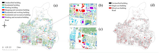 Buildings’ mixed-use inference results in the Tianhe District: (a) building function inference results, (b,c) local enlarged views, and (d) distribution of mixed-use buildings.
