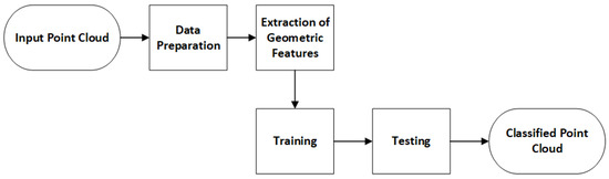 Supervised learning approaches that assign labels individually to each point in the point cloud can often be chosen. Weinmann et al. [9] examined the use of different features for point cloud classification and the most appropriate support selection and different classifiers. The features that mostly affect the accuracy among produced features were determined by using feature selection methods. The Oakland 3D Point Cloud Dataset and Paris-rue-Lille Dataset, which are mobile laser scanning data, were used as the dataset. Random Forest was found to be the most effective classifier as a result of the evaluation. Vosselman et al. [10] used 19 geometric features that were extracted from the point cloud in the study. In the proposed method, the point cloud was divided into certain groups and classified. The Vaihingen and Rotterdam datasets of International Society for Photogrammetry and Remote Sensing were used as the dataset. Conditional Random Field algorithm was selected as the classification method. Resultantly, group-based classification exerted better results than point-based classification. The landslide was investigated by using point clouds in [11]. Objects were specified in the point cloud for object-based classification. Features were extracted from the point cloud to identify these objects. Classification was conducted via Support Vector Machines (SVM) and Random Forest (RO) methods using the extracted features. Seven classes were classified: landslide slope, eroded area, sediment, medium and high vegetation, small grasses, high grasses and rocks. In the study conducted by Belgui et al. [12], the buildings were detected from the point cloud which was divided into three sub-classes; small buildings, apartment buildings and industrial buildings. In the study, the RF algorithm was trained using the features extracted from the point cloud. The extracted features were more related to height. Guo et al. [4] proposed an ensemble-learning algorithm named JointBoost for point cloud classification. Ensemble methods aim to create a strong classifier by combining more than one weak classifier. In this study, five classes were classified as building, land, vegetation, power line and power line poles. 26 features were extracted from the point cloud for each point. The proposed approach had two stages. In the first stage, classification was realized with the JointBoost method by using the 17 most effective features. In the next stage, unreliable or misclassified points were again classified by the k-NN method. Landslide regions were determined in the point cloud in [13]. For this purpose, Digital Terrain Model (DTM) produced the point cloud and aerial photographs were used. Firstly, 52 pixel-based features such as slope gradient, plan curvature, roughness and sky view factor were determined on DTM. These features were then transferred to the objects determined by Object-Based Image Analysis (OBIA). An RF-based feature selection algorithm was performed prior to classification because of the large number of features. RF and SVM algorithms were used as classifiers. The study proposed by Plaza-Leiva et al. [14] focused on the efficiency of the spatial shape features obtained from the covariance analysis for improving computational load and accuracy of the supervised learning classification. For this purpose, eigenvalues were calculated for each point from the point cloud. The classification was based on three classes: city buildings, natural vegetation and artificial vegetation. Four different supervised learning algorithms were compared: SVM, artificial neural network, Gaussian operation and Gaussian mixing models. In [15], a supervised classification was performed in both residential areas and forest areas. Five geometric properties were used from the point cloud: linearity, planarity, sphericity, horizontality and height change. SV machines, RF, logistic regression and linear discriminant analysis were chosen as classification algorithms. As a result of classifications with different support radius, an accuracy of approximately 80% for the residential area and 93% for the forest area has been obtained by using RF. In another study [16], supervised classification of point clouds was done using geometric properties. In the study, four different datasets, including color information of points besides 15 geometric features, were used. Ground, high vegetation, building, road, car and human-made objects classes were extracted with RF and Boosted Tress methods. A photogrammetric point cloud was used for training and testing. In the Lin et al. [3] study, the aerial point cloud was classified according to three geometric properties, namely linearity, planarity and sphericity, by using SVM. In the method proposed, it was aimed to increase the classification accuracy by weighting the covariance matrix. The targeted classes were divided into buildings and non-building structures.