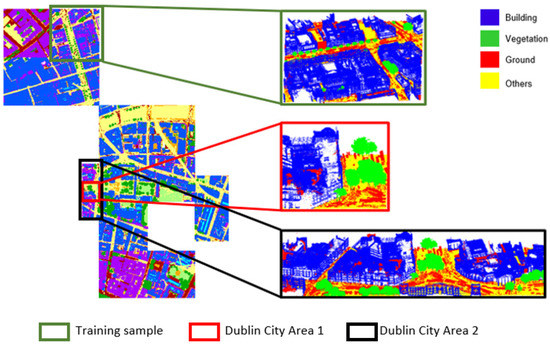 The proposed approach was evaluated for three different point cloud datasets of Dublin City, Vaihingen and Oakland3D that included urban areas. The Dublin data set was produced in 2015 by the Urban Modeling Group at University College Dublin (UCD) by scanning with ALS in Dublin City Center. 260 million out of 1.4 billion points have been labeled. The density of the point cloud varied from 250 to 348 points/m2. The point cloud consisted of 13 regions in total. In this study, since it was not possible to use the whole dataset due to hardware deficiencies, only two regions were selected and used. These two study regions covered approximately 20 million points. A training area (Figure 2) that covered approximately 12 million points was selected. In this area, points labeled as “undefined” were eliminated and for the rest of this process, 970,000 points were selected randomly from the dataset used for training to provide an advantage in efficiency and speed. Two test sites of Dublin City Area 1 and Dublin City Area 2 (Figure 2) with approximately 1.6 million points and 7 million points were defined for testing. While selecting Dublin City Area 2, attention was paid to cover Dublin City Area 1 as well.