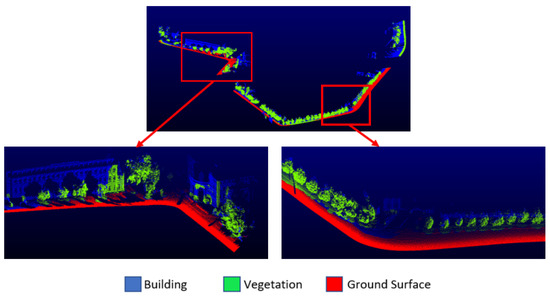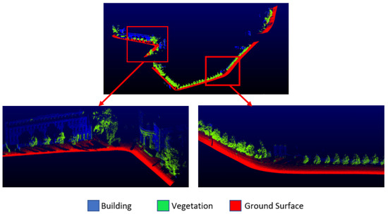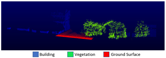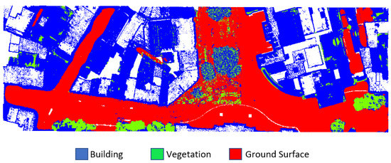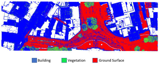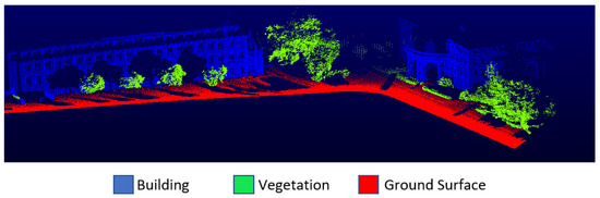 The Oakland dataset, one of the most used MLS datasets, was also selected for the application. This dataset was obtained with a mobile platform and covers the urban environment. The Oakland dataset consists of 36,932 training points, 91,579 validation points and 1.3 million testing points, which include 5 classes, namely ground, vegetation, façade, wire and pole/trunk. The wire and pole/trunk classes were removed, so they contain a few points. The façade class was renamed as building. Training (Figure 4) and testing (Figure 5) parts were used in the study. All datasets had ground truth. The distribution of the training and test data of the datasets are given in Table 1.