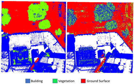 Classified point cloud with the highest accuracy (left) and with lowest accuracy (right) in the Vaihingen dataset.