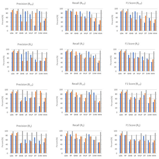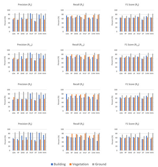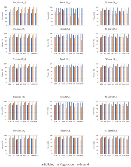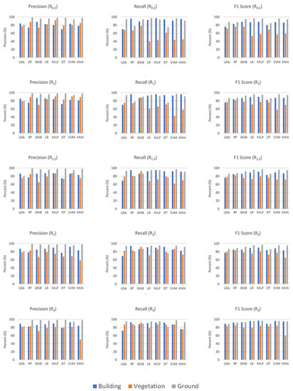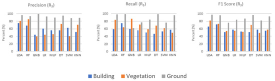 In Dublin City Area 2, there were some differences from Dublin City Area 1. While all values increased rapidly in support radius greater than R0.5 in Area 1, the values of metrics at a small radius in Area 2 did not increase in the same way. High metric values were obtained in the support of R3 for almost all methods. Although precision was not affected by the radius change, recall and F1 score had low values in the support of R0.5. MLP and LR (in R3 support), the best methods for building class extraction, had 97% and 96% F1 scores, respectively. The method with the lowest F1 score was the LDA method with 89% (in R3 support). Vegetation class was detected with lower success in all supports than other classes. For the vegetation class, RF was the most successful method in terms of F1 score (86% for R3). KNN was quite insufficient for extraction of vegetation. The highest F1 score was obtained with 72% in R1.5 support. Although the ground surface class did not have values close to 100% in Area 2 as in Area 1, because the test data was larger, precision, recall and F1 scores were generally obtained above 90% for all methods (Figure 13).