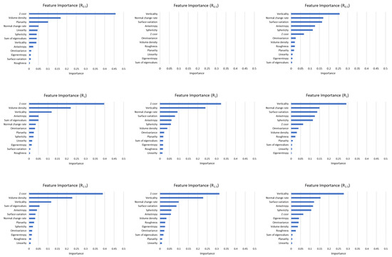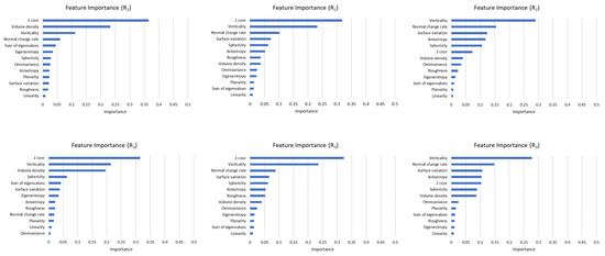 Geometric features affected the accuracy at different rates. This situation was defined as feature importance. Some methods calculate the feature importance value. RF is a method to obtain an ordered list of them. The most important feature in both datasets was the Z coordinates of the points. Other important features for the Dublin City dataset were verticality and volume density. The least important feature was linearity. The roughness feature was also of low importance except for the R3 support. In the Vaihingen dataset, verticality was the second most important feature. While the least important feature was Linearity, the importance of roughness increased as the support radius grew. Since most of the values were obtained as NaN, no evaluation was made for R0.5 in the Vaihingen dataset. Feature importance values calculated for each study area were presented in Figure 16.