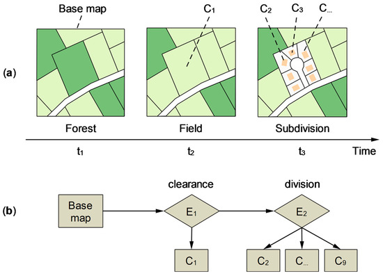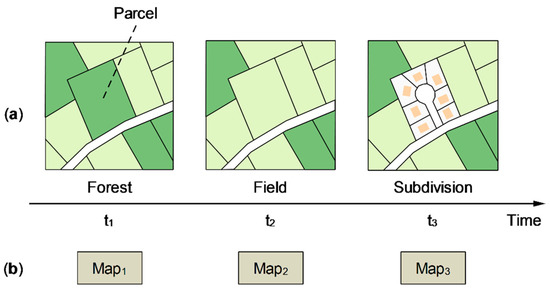 This first level mainly corresponds to temporal snapshot models. For instance, we can mention the sequential snapshots model [17,72], the simple time-stamping model [17,73] as well as the space-time composite model [17,74]. In the sequential snapshots model, temporal information is managed by a multitude of static geographical layers. Each geographic layer is an entire copy of the territory of analysis, representing the geographical objects at a specific time. Figure 2 illustrates how this model operates. We take as an example the evolution of a parcel that initially contains a forest (Figure 2a). The forest is cleared and then cultivated for several years. Then, the parcel is sold to a real estate developer, who then divides it into lots for sale. Each of the temporalities t1, t2, and t3 corresponds to a temporal snapshot of the entire study area (Figure 2b).