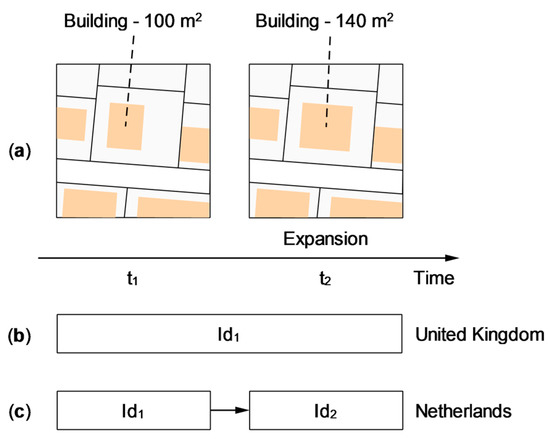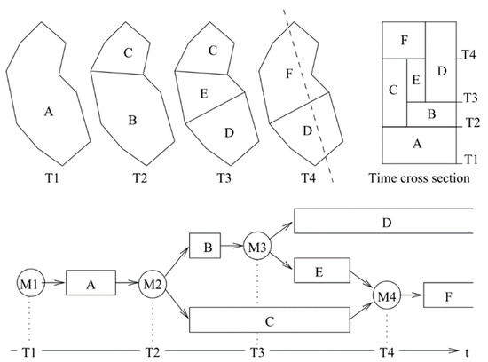 In this second category, changes are explicitly modeled. However, the spatio-temporal phenomena at the origin of these changes are still left out. These models focus on changes occurring in objects, their attributes, or their relationships. They include models such as the history graph model [36,37,87] and the life-motion-succession model [88]. We could also include other models such as identities through time [89] and identity-based change [43,90,91]. However, these last two models also rely on changes in the identity states of geographic objects, which are discussed in more detail in Section 3.5.