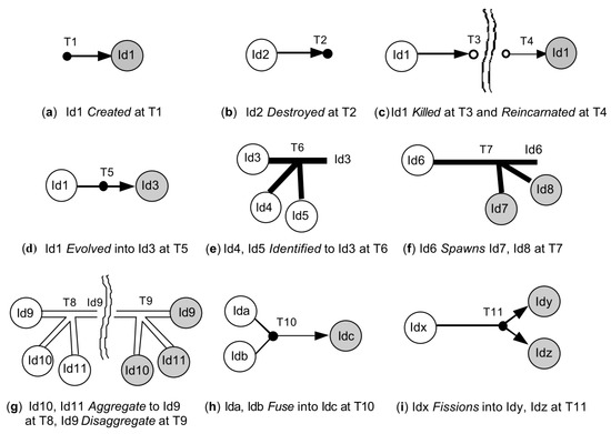 We notice that each model provides its own classification of transitions. For example, the history graph model proposes seven transitions, namely creation, alteration, destruction, reincarnation, split/deduction, merge/annexation, reallocation [87]. The identity-based change model, focusing on the notion of composite objects, introduces 29 transition operations [90,91]. Figure 4 represents the set of operations defined by Al-Taha and Barrera [89]. These transitions were subsequently extended by Hornsby and Egenhofer to develop the identity-based change model.