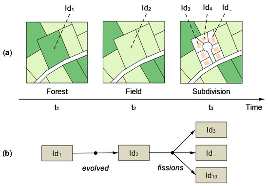 The filiation relation indicates a dependency on identity. It defines the succession link that exists between different representations of the same object at different moments of time [127]. This relationship helps to maintain the identity of an evolving object and can be used to identify the child objects resulting from evolution. Two main types of filiation relationships can be distinguished: continuation and derivation [43,127,128,129]. Continuation preserves the identity, which means that an object continues to exist despite the changes (e.g., a person’s identity persists throughout life). This is the case of preserving identity through time as formulated by Plato (Section 3.5.1). In the derivation, a new and distinct object is created from an earlier object (e.g., a new cadastral parcel is the result of the division of a previous parcel, see Figure 7. In addition, unlike continuation relations, derivation relations may involve several objects at the same time.