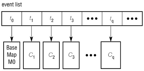 TEMPEST [33] is a ST-GIS relying on the triad framework [31] approach. The model works as following: starting with an initial state (the base map), events are recorded in increasing temporal order, with each event associated with a list of changes that occurred since the last update of the event list (Figure 6). This solution is similar to the one proposed by Yeh and Cambray [112] in the highly variable spatio-temporal data model. As stated in the triad framework, an event may represent a sudden change or can be triggered when a set of small changes is considered to be significant enough to create a new record.