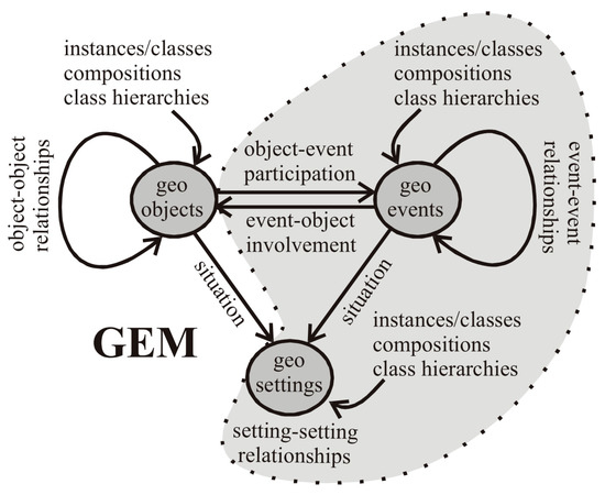 Worboys and Hornsby [105] describe GEM as an object-based model extended by the concept of the event. This model is based on Worboys’ previous work on events [2] as well as Grenon and Smith’s work on continuants and occurrents [44]. Galton provides a short definition of continuant and occurrent: “A continuant exists wholly at each moment of its existence. It endures through time, possibly gaining or losing parts, and changing with respect to some of its properties. It may have spatial parts but not temporal parts. An occurrent unfolds over time (it “perdures”), and has temporal (and possibly also spatial) parts.” [104]. In this model, the continuants are the objects (e.g., houses, roads, cities...) and the occurrents are the events (e.g., a house repair job, road construction project, urban expansion...). GEM is based on three elementary entities: objects, events, and settings (Figure 8). The distinguishing characteristic of a geospatial entity is its setting, whether an object or an event. A setting can be purely spatial (e.g., point, line, or surface), purely temporal (e.g., instant, interval, or period), or a spatio-temporal (e.g., trajectory, history, or geospatial lifeline). However, an object or an event cannot be contained in more than one setting at a time. In addition, the object is considered static, i.e., timeless. Thus, the settings in which an object can be situated are purely spatial.