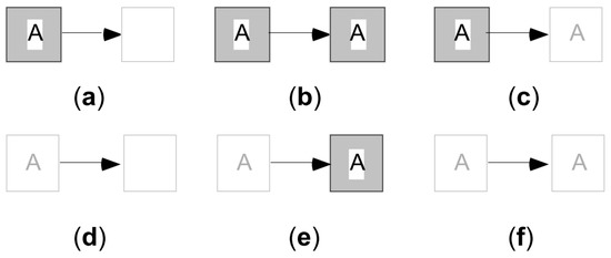 Identity-Based Change, examples of identity operations on single objects: (a) create, (b) recall, (c) reincarnate, (d) continue, (e) eliminate, (f) destroy (redrawn from [43]).