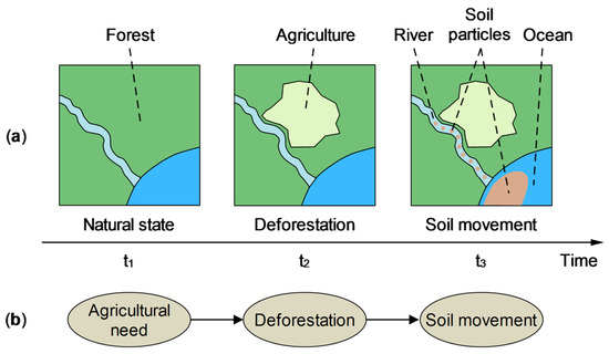 Example of the evolution of a land area represented by states and transitions, (a) representation of the real-world entities, (b) geographic objects’ changes through a succession of states (rectangles) and transitions (arrows).