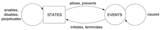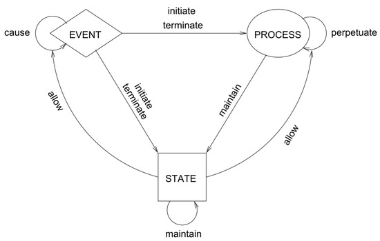 According to Yuan, “Events are essential to understanding the world and communicating the understanding” [95]. The main idea of this third level is to explicitly model the events that have caused the changes (but not necessarily the changes themselves). As stated by Worboys [2], the event-type entity corresponds to the occurrents (events, process, actions) introduced in the SPAN ontology. In the literature, the term “event” is very often associated with the one of “process”. These two terms are used to qualify the dynamics of geographic objects. However, in GIScience, there is no consensus on the exact meaning of the words “event” and “process” [41,96,97,98,99]. This may be explained to some extent by the distinct interpretations they may convey in spatio-temporal modeling processes. Thus, these two concepts vary considerably from one author to another. As a result, several ways exist to approach the multiplicity of definitions. For example, Worboys [2] mentions an “astonishing variety of usage and definition”, pointing out that “one person’s process is another’s event, and vice versa”. Galton [100] argues that such discussions not only concern the terminology but they also significantly affect the conceptual foundations of how we represent and reason about the world. More information on these concepts can be found in Galton’s work [100,101,102,103,104].