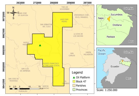 The study area corresponds to the Paraíso Biguno Huachito and Intracampos Block (PBHI), better known as Block 47 (0°12′27″ and 0°29′40″ S, 76°53′14″ and 77°5′28″ W), northwest of the province of Orellana. It covers part of the parishes of Lago San Pedro, Joya de los Sachas, San Carlos, El Dorado, Nuevo Paraíso, San José de Guayusa, San Sebastián del Coca, and the cantonal capital of Puerto Francisco de Orellana, known as El Coca (Figure 1). The study area is > 38,000 ha, and it is located within a tropical rainforest region with a humid tropical climate (according to the Köeppen classification), with consistent rainfall throughout the year, and annual precipitation of 3319 mm [33,34]. This region is mostly covered by forest and agricultural land. It has high influence of activities related to oil extraction, and as a result, human activities linked to the oil industry and agricultural activities represent almost half of the employment sources in the region [35].