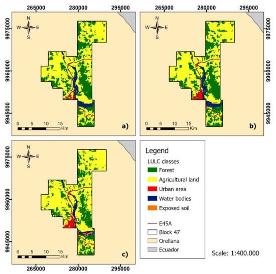 According to the National Institute of Statistics and Census (INEC), in 2001 the province of Orellana had a population of 86,493 inhabitants, by 2010 it had 136,396 inhabitants [44], and the projection for 2018 was 157,520 inhabitants [45]. In the first period of analysis, land cover classes in Block 47 did not undergo major variation (Table 1), with the exception of urban spots that were duplicated. During the last period, transitions were evident for all classes, especially a continuous expansion of urban areas, a sudden extension of exposed soils, and an increase in agricultural land (Table 1). These changes, in particular the continuous expansion of populated zones, are related to the consolidation of settlement as a manifestation of the mobility of people working in the region, linked directly and indirectly to the oil industry.