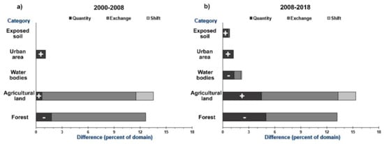 The period 2008–2018 shows a greater interaction between the existing classes within Block 47 (Figure 3b). The forest and agricultural land classes present this interaction, with high area gains for agricultural areas and area losses for forests. Likewise, the pattern of exchange difference between forests and agricultural land is again evident, but to a lesser extent compared to the 2000–2008 period. On the other hand, the classes of exposed soil and urban areas experienced slight differences in quantity, increasing their area by less than 2%.