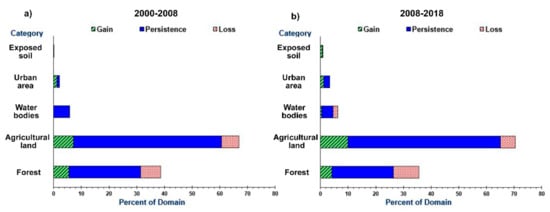 Gain, persistence, and loss in relation to the percentage of dominance for each class, referring to the periods 2000–2008 (a) and 2008–2018 (b).