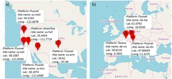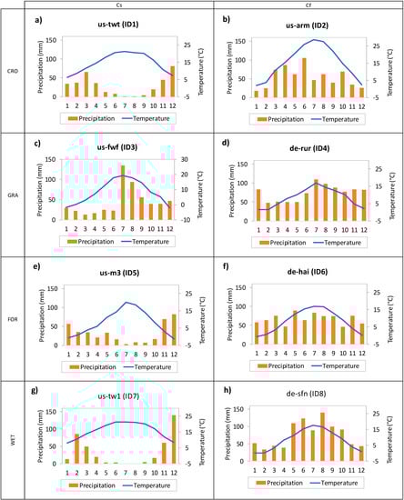 For what concern the selection of the vegetation type, grasslands and forests have been considered since they are among the largest ecosystems in the world covering respectively about the 40% and 30% of the earth’s land area excluding Greenland and Antarctica [44,45]. Cropland has expanded rapidly in order to feed the world’s growing population [46] while wetland, although represents a small portion of the landscape, is found throughout the world [47]. Grassland ecosystems (GRA) are areas covered by grass-dominated vegetation with little or no trees and a variable intensity of meadows, steppes, and grasslands grazed. Cropland (CRO) is farmland with agricultural and/or horticultural products. The forest cover (FOR) includes terrestrial habitats dominated by trees and other woody plants. The wetland (WET) consists of permanent mosaic of water and herbaceous or woody vegetation. With respect to the climate, sites located in Mediterranean and Oceanic areas have been considered since they present very different temperature and precipitation annual patterns, with a marked seasonality in the case of the Mediterranean climate over the temperate Oceanic. Indeed, according to the Koppen classification, the Mediterranean climate (Cs) has mild, wet winters and warm-to-hot, dry summers with the precipitation mainly occurring during winter and autumn. The subtypes “Csa” and “Csb” represent a Mediterranean climate with average temperature respectively above and below 22° during the warmest month. The oceanic climate (Cf) is characterized by cool winters and warm summers, and the rainfall events are evenly dispersed during the year. Cf has the two subtypes “Cfa” and “Cfb” too. Eight areas with the considered biomes have been selected for the present study including “us-twt” (FLUXNET2015 DOI:10.18140/FLX/1440106) located on Twitchell island, Sacramento Country, California (USA) [48,49], “us-tw1” located on Twitchell island, Sacramento Country, California (USA) (FLUXNET2015 DOI:10.18140/FLX/1440108) [50,51,52], “us-arm” located near Billings, in northwest Noble County, Oklahoma (USA) (FLUXNET2015 DOI:10.18140/FLX/1440066) [53,54], “us-fwf” located near Flagstaff, Coconino County in Arizona (USA) (AMERIFLUX DOI:10.17190/AMF/1246052) [55,56], “de-rur” located in Simmerath, north Rhine-Westphalia (Germany) (https://deims.org/356417de-5a3c-429d-82c1-08a4e924ab3b, accessed on 20 January 2021) [57,58], “de-hai” located within the Hainich National Park in central Germany close to the city of Eisenach, western Thuringia (FLUXNET2015 DOI:10.18140/FLX/1440148) [59,60,61], “de-sfn” is located near Seeshaupt, Weilheim-Schongau district, in Bavaria, Germany (FLUXNET2015 DOI:10.18140/FLX/1440219) [62,63], “us-me3” located near Sisters, a city in Deschutes County, Oregon, United State (FLUXNET2015 DOI:10.18140/FLX/1440080) [64,65,66].