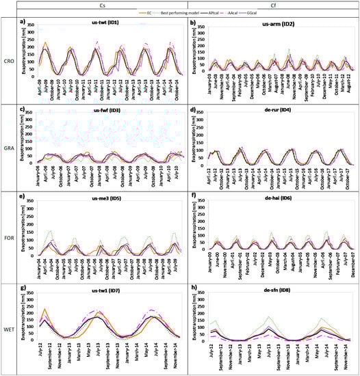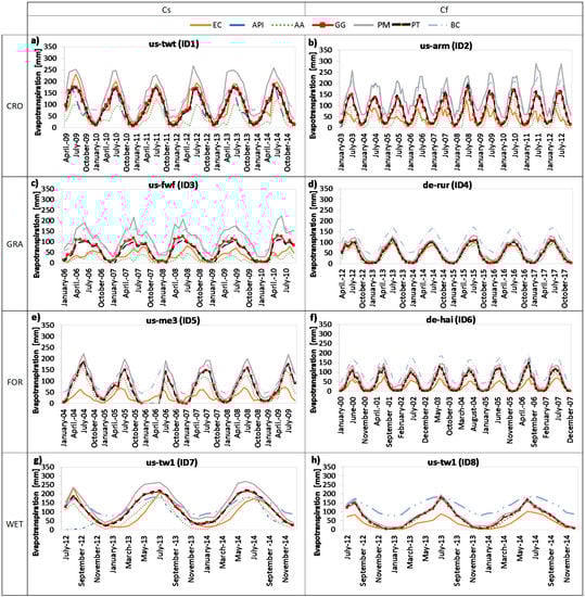 For this reason, additional studies in this field are encouraged. Within this framework, in the present study, a comparison among six approaches through eight experimental sites has been performed. Among the PET models, Priestley–Taylor (PT), Penman-Monteith (PM), and Blaney–Criddle (BC) approaches have been considered while among the AET models, the Advection-Aridity (AA) model, the Granger and Gray (GG) approach, and the Antecedent Precipitation Index (API) model have been selected. The eight experimental sites used for the comparison belong to the TERENO, AmeriFlux and FLUXNET networks. They are featured by different climate conditions including Mediterranean and temperate Oceanic climates, and different vegetation types which are grasslands (GRA), croplands (CRO), forests (FOR), and wetlands (WET). The performances of the six models for the eight experimental sites have been tested and compared with the aim of providing recommendations about the method which can be more effectively used with or without a calibration process and furthermore the impact and the importance of the calibration itself can be identified. Indeed, the calibration of the models to local conditions appears to be fundamental in order to reduce the errors resulting from the application of the approaches to regions different from those in which they were originally developed [38,42].