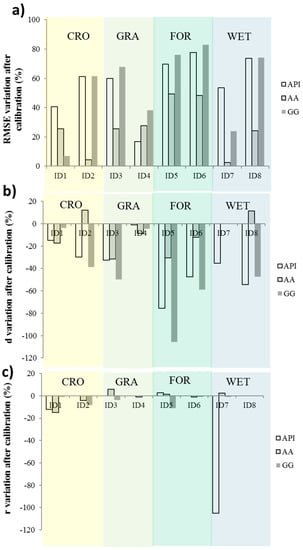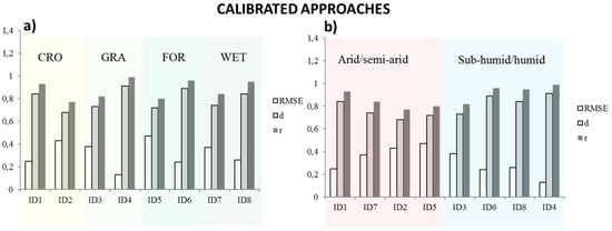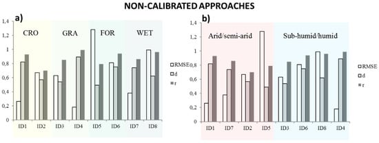 A summary of the goodness of fit indices referring to the non-calibrated best performing approach for each site and with reference to the specific land cover type and climate condition has been reported in Figure 4. The highest prediction errors are reached for forest ecosystems and arid/semiarid conditions where the values of RMSEd are close to 1.2 while the grassland environments and the humid/sub-humid climates present the better accuracy with RMSEd around 0.2.