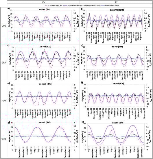 Besides the quantitative aspect, the temporal patterns of monthly observed Rn and Gsoil plotted against the modelled ones are shown in Figure 5. The figure reveals, at first sight, that they differ both in terms of temporal dynamics and magnitude.