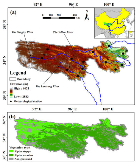 Location of the Three-River Source Region (TRSR) in China (a). The main map presents the digital elevation model (DEM) of the TRSR. The black circle denotes the meteorological station. The grassland type of the TRSR is shown in (b), and the light and dark green regions denote the alpine steppe and meadow, respectively. The non-grassland types are masked by gray color.