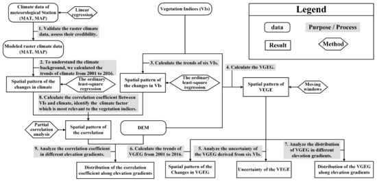 The procedure of data processing and analysis in this study is shown in Figure 3. At first, we evaluated the credibility of raster climate data by using observed MAT and MAP from the meteorological stations. We calculated the trend of MAT and MAP to understand the dynamics of climate in the TRSR better. Then we investigated the spatial pattern of VI trends. After that, we combined VIs and DEM data to calculate the spatial pattern of VGEG. The changes in VGEG from 2001 to 2016 were also analyzed. In addition, we analyzed the distribution of VGEG in different elevation gradients. At last, we calculated the correlation coefficients between VIs and climate factors (MAT and MAP) and their elevational distribution to identify which climate factor had the highest correlation with the VIs at different altitude gradients.