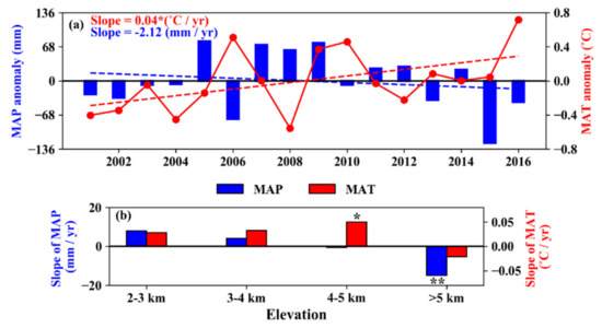 Trend of the mean annual temperature (MAT) and mean annual precipitation (MAP) anomaly (a) and their slope along the elevation gradient (b) in the TRSR from 2001 to 2016. * and ** denote that slope was statistically significant at the 0.05 and 0.01 level, respectively.