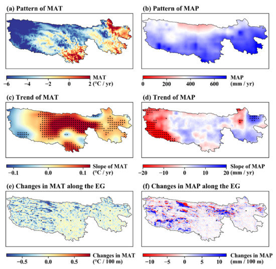 Pattern: (a,b), trend: (c,d) of MAT (mean annual temperature) and MAP (mean annual precipitation), and their changes along the EG (elevation gradient) (e,f) in the TRSR from 2001 to 2016. The regions with black dots indicate that the trend is statistically significant at the 0.05 level.