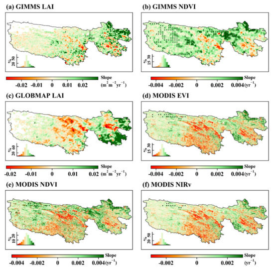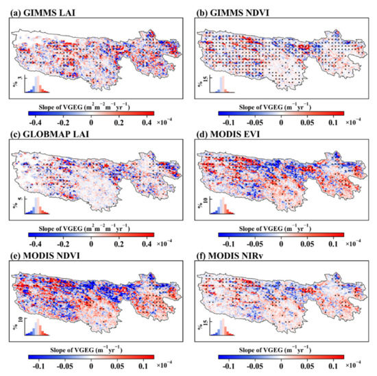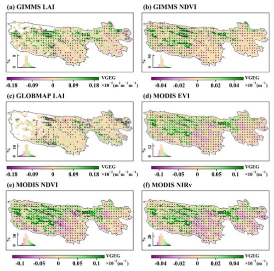 Spatial pattern of the VGEG (Vegetation Greenness along the Elevation Gradient) variation from 2001 to 2016. (a): Global Inventory Modeling and Mapping Studies leaf area index (GIMMS LAI); (b): GIMMS Normalized Difference Vegetation Index (NDVI); (c): Global Mapping (GLOBMAP) LAI; (d): Moderate Resolution Imaging Spectroradiometer Enhanced VI (MODIS EVI); (e): MODIS NDVI; (f): MODIS near-infrared reflectance of vegetation (NIRv). The value frequencies are shown in the bottom left inset for each panel. The regions with black dots (generated by 9 × 9 windows) indicate that the trend is statistically significant at the 0.05 level.